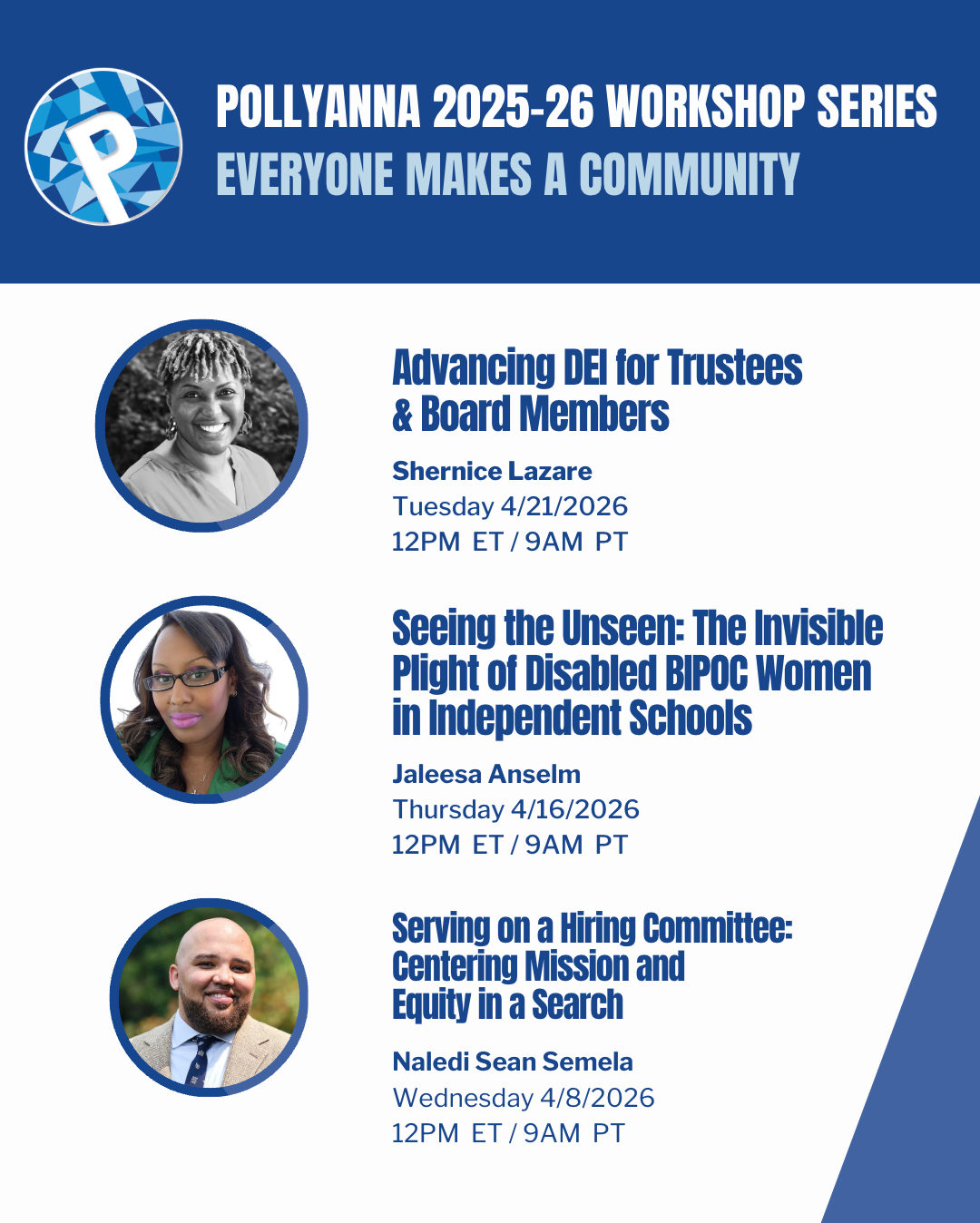 | | | | Dear Friend, With Earth Day this month, we are invited to care for something larger than ourselves—our planet, and also our communities, our schools, our cities, and our country. Care asks us to pay attention. To stay present. To remain grounded in what is real, even when that reality feels complicated or uncomfortable. Right now, many of us are navigating a climate of uncertainty and, at times, great fear. In schools and communities across the country, there is a growing hesitation about what can be said, what should be said, and how to lead with integrity in moments that feel increasingly fraught. But care is not passive. It requires engagement. This month, we are creating opportunities to do just that. We invite you to join us for our upcoming panel, Navigating a Culture of Fear—a timely and honest conversation with school leaders who are choosing to lead with clarity, courage, and care, even in challenging moments. And we invite you to take the next step by joining the Pollyanna Circle Membership. The Circle is designed to support you throughout the next school year—with access to 20 online workshops, Teen Council special leadership opportunities, a discount on our National Conference, and a community committed to connection and action. This is a moment to stay grounded. This is a moment to stay engaged. This is a moment to lead. Because Building Stronger and Kinder Communities requires all of us. Warmly, | |  | | | | | Navigating a Culture of Fear Pollyanna is creating space for an honest and grounded conversation about how to lead through this moment. Jason Craige Harris will facilitate a panel of school leaders featuring a Head of School, Trustee, Chief Community Life & Well-Being Officer, and Department Chair. This conversation focuses on leadership: how school leaders remain steady, values-driven, and thoughtful in moments of tension. Join us for our free panel on Zoom, April 29, 9-10AM PT, 12-1PM ET | | | | | | Pollyanna's Circle Membership 2026-27 Year-Long Learning. Stronger Communities. One Annual Fee. Join the Pollyanna Circle and equip your entire school community with the programs, tools, and inspiration needed to Build Stronger and Kinder Communities all year long. Program begins July 1, 2026. Become a founding member and gain expanded access to the resources schools rely on most from Pollyanna. Click here for more information and to register. And if you were a National Conference school, don't forget to add your discount code. | | | | | | | | Teen Council: AI and the Future of Inclusion On April 19, inclusion strategist Samantha Hosein joins the Teen Council and explores the intersections of artificial intelligence, inclusive leadership, and equitable organizational change. She will discuss how AI may shape education, workplaces, and leadership practices while fostering inclusion and fairness. If you're 13-18 years old and would like to join a great group of students from across the country, fill in this form and we'll be in touch. | | | | | | April's Workshop Series Join us for three strong sessions: April 8: Naledi Semela's for all serving on hiring committees April 16: Jaleesa Anselm's for all community members April 21: Shernice Lazare's for trustees or future trustees Our upcoming workshops are filled with incredibly strong content which is very needed now. See you on Zoom | | | | | | | | | | | | | | | | Our Board Together The Pollyanna Board dinner reminded us of something simple but important: the work we do together is strengthened by the time we spend simply being together. Our trustees gathered for a purely social evening at a trustee’s home. No agenda, no presentations. Just conversation, laughter, good food, and the chance to reconnect in person. It was a beautiful evening and a wonderful reminder that the strength of organizations begins with the relationships that sustain it. We appreciate their strong commitment to our work. | | | | Raising Compassionate Kids Jason Craige Harris spoke with parents and caregivers at The Town School in New York City as part of their All-School Speaker Series on a topic that feels deeply urgent right now: Raising Compassionate Kids in a Polarized World. When we cultivate compassion in our homes, we are not only strengthening our families—we are preparing the next generation to move through the world with empathy, courage, and humanity. | | | | | | | | The Teen Council is Shaping The Future In March, the Pollyanna Teen Council gathered with poet, educator, and equity practitioner Noah Arhm Choi for a thoughtful conversation on media literacy, misinformation, and allyship. In a moment when the information landscape can feel overwhelming, the dialogue centered on how young people can stay sharp, stay kind, and stay hopeful. The conversation was a reminder that young people are not just navigating today’s media landscape—they’re shaping a more thoughtful, informed, and compassionate one. | | | | | | | | National Conference 2026 Sponsor Workshop Building on the energy of the National Conference, our Sponsor Workshop brought this group back together. Sponsors shared their work, reinforcing what’s possible when we stay connected in service. Jason Craige Harris moderated the panel with Chrysalis Consulting, DoSomething.org, James Education, Katie Rocker Leadership Solutions, Klingenstein Archival Project, Meredith Herrera Consulting, Private School Axis, Strategenius, and teachAAPI. We missed The Boys Room, Educating for Equity, Joy-Raising, Private School Village and VHH Consulting. Congratulations to The Madeira School in Virginia, winner of the raffle for a Pollyanna Circle Membership! | | | | | | | | | | | | Call for 2027 Pollyanna National Conference Workshops Have an idea or practice to support school communities? Submit a workshop proposal for the 2027 Pollyanna National Conference. This year’s theme—Building Stronger and Kinder Communities: The Power of Us—focuses on how individual and collect